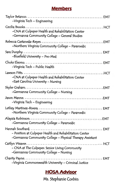 Students who participated in HOSA’s state leadership conference in March were also recognized for their outstanding performances Emergency Medical Technician competition. These students will be traveling to Dallas, TX in June to attend the International Leadership Conference and compete at the national level.